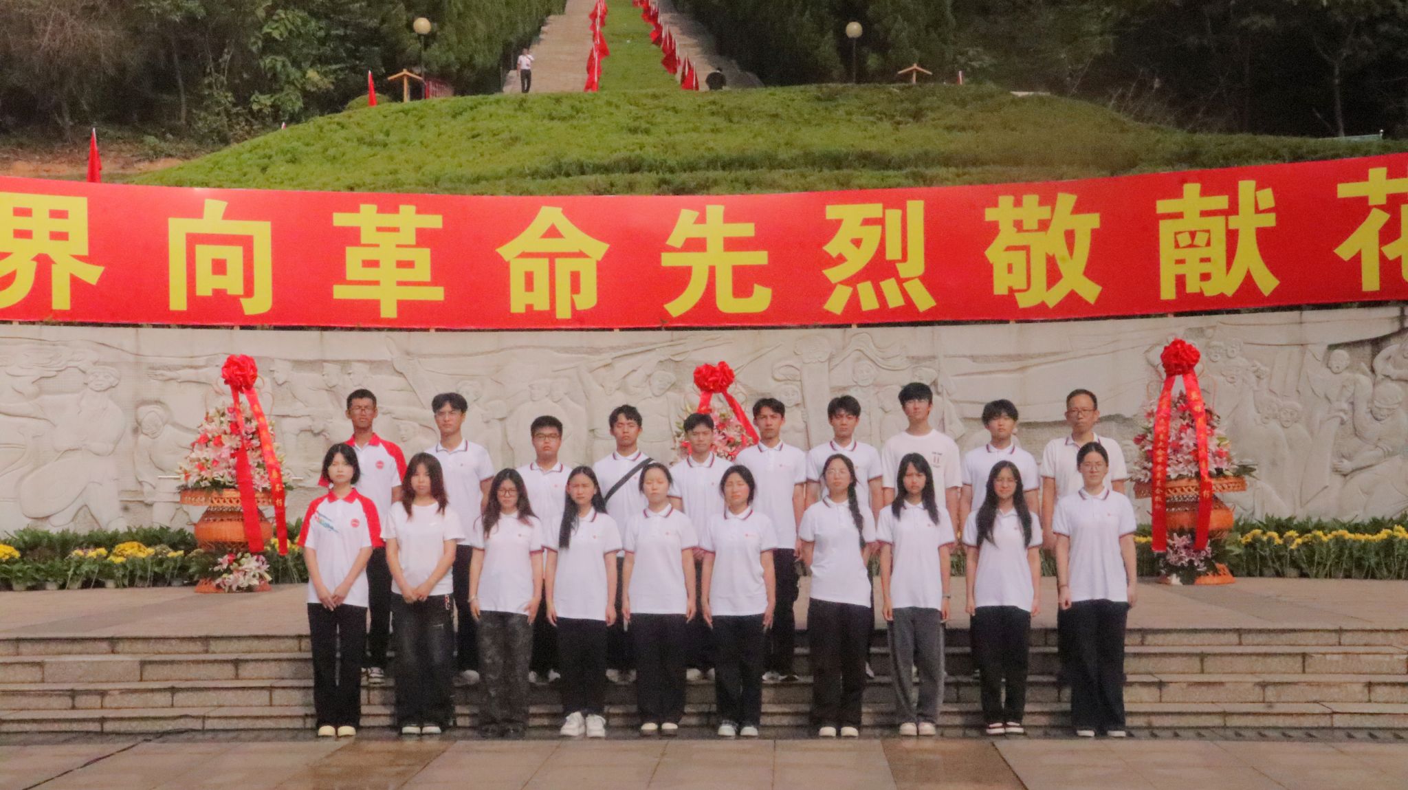 青山埋忠骨,松柏映英魂。清晨的仰天岗革命烈士陵园庄严肃穆,丰碑矗立。师生代表手持鲜花,列队肃立于烈士纪念广场,神情凝重,心怀崇敬。